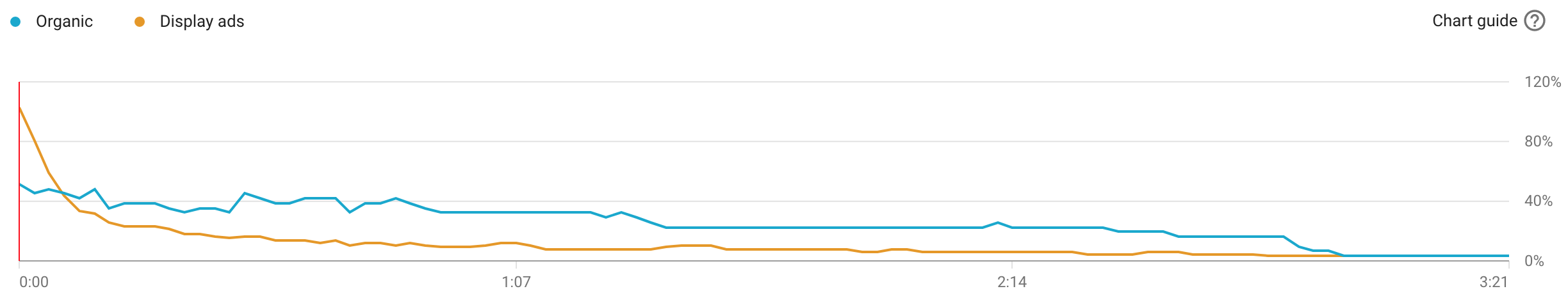 There are two lines here: the orange line is users coming in from the advert and the blue line is organic users who found the song naturally (I think). The users coming in from the advert lost interest very quickly compared to organic users who tended to hang around (which is nice).