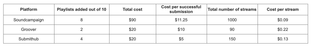 Groover and Submithub work much the same way: you pay about $2 or $3 to submit to an individual playlist curator. Soundcampaign works very differently: you select a genre(s) and declare a budget and the system comes up with a shortlist of curators for you which it then sends your track. But it’s much more expensive at about $9 per submission. You cannot target individual playlists with Soundcampaign which makes for a ‘lucky dip’ experience (which I actually quite enjoyed truth be told).